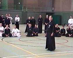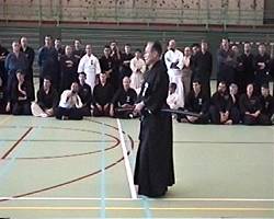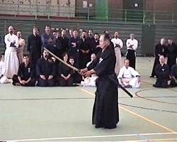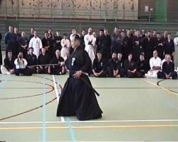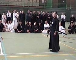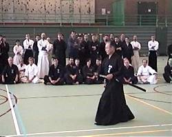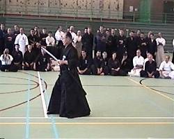 Draw and turn, sword horizontal. Thrust onehanded to the suigetsu.
